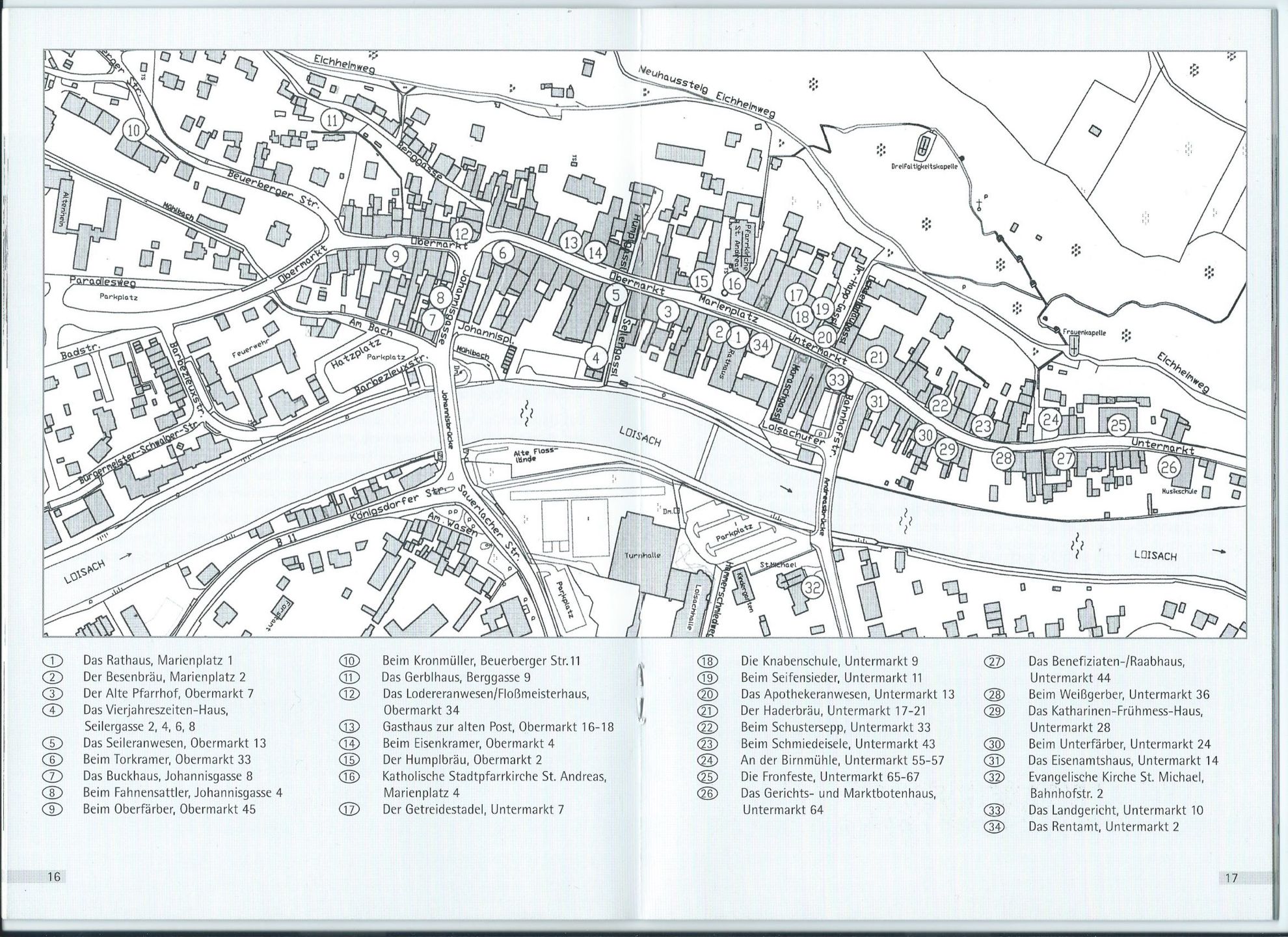 Apothekeranwesen • Benefiziaten-/Raabhaus • Besenbräu • Birnmühle • Buckhaus • Eisenamtshaus • Eisenkramer • Kirche St. Michael • Fahnensattler • Fronfeste • Gerblhaus • Gerichts- und Marktbotenhaus • Getreidestadel • Haderbräu • Humplbräu • Kath. Stadtpfarrkirche St. Andreas • Katharinen-Frühmess-Haus • Knabenschule • Kronmüller • Landgericht • Lodereranwesen/Floßmeisterhaus • Oberfärber • Alter Pfarrhof • Rathaus • Rentamt • Schmiedeisele • Schustersepp • Seifensieder • Seileranwesen • Torkramer • Unterfärber • Vierjahreszeiten-Haus • Weißgerber • Gasthaus Zur Alten Post